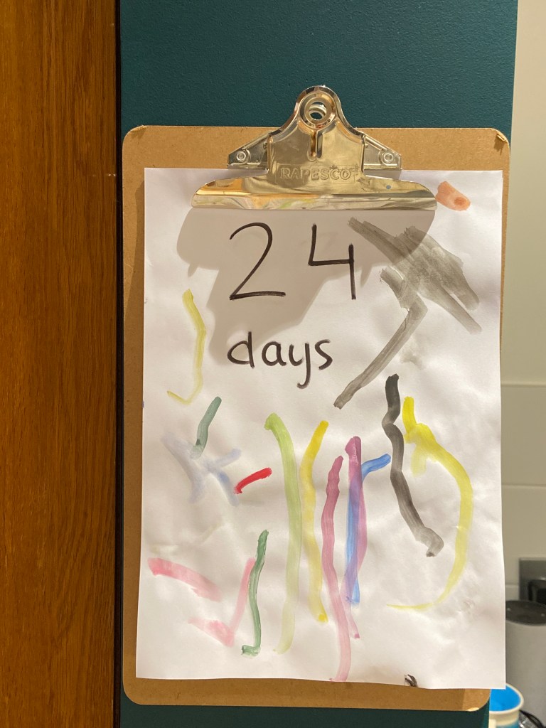 So I thought we could make a counting down calendar for us all to count down the days for when baby brother arrives. So we did! We haven’t done all days yet, as it’s hard to get a toddler to sit and do the same task for a long stretch. But here’s a couple of photos of what we did.